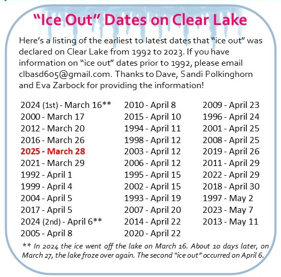 Dues: 20$ per year, Make checks payable to: CLBA and send to CLBA, PO Box 82, Lake City, SD 57247, (each spring a newsletter is sent to residents at Clear Lake with a stamped envelope to pay dues. If you were missed, we apologize. Also, if your address or situation has changed, please contact the CLBA Treasurer, Sandi Jaspers at sandi.jaspers@gmail.com to make corrections. Thank you